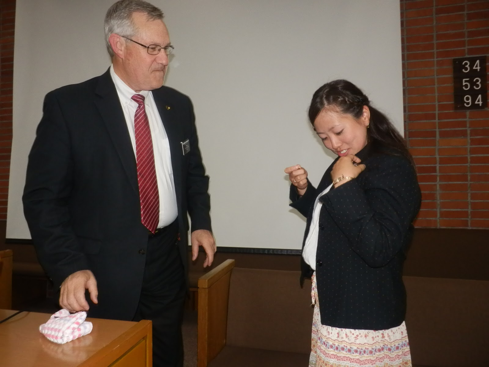 The entire Aomori Zone had purple ties and purple blouses. They also had little pins of Mori (a tree) they all were wearing and they gave us pins to wear also. We were impressed at the tight unity we felt in that zone. This picture is Elder Ishida, a Zone Leader, giving Gary his pin.